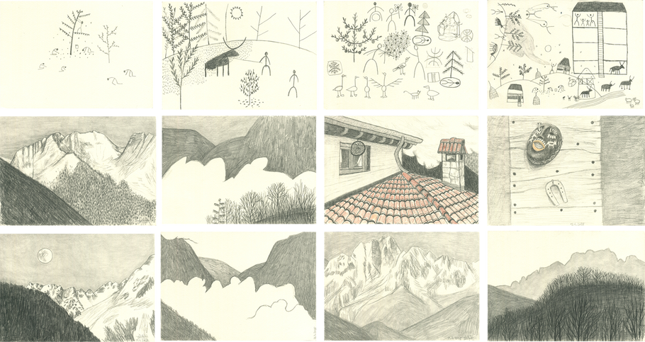 This is a selection of works I made in Saviore dell'Adamello during a two-week journey which was financially supported by the Culture Moves Europe mobility programme for artists in April 2025. My focus followed two threads: the drawing part and the sewing one. Through the drawings I wanted to carry further something from the atmosphere of this village in Lombardia, surrounded by mountains and situated right above Valcamonica, or The Valley of Signs, as it is also called. Many rocks found in this valley carry traces left by prehistorical people who inhabited the area. These traces are carved signs which give us clues about our ancestors' way of living, but also about how they view themselves in the world. Part of the drawing series is the result of asking myself: "If I had to communicate something about my life to a prehistorical human being, how would I do that?"