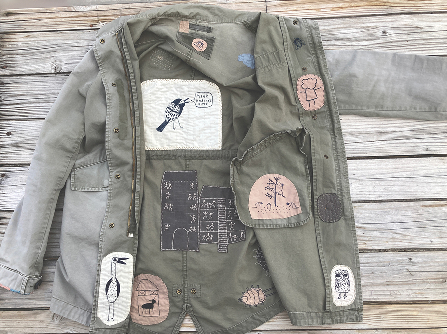 The second thread was... a jacket. This piece of clothing I wore for more than 10 years and still do. My aim was to turn it into a wearable metaphor: quiet on the outside, singing on the inside. The other aim was to repair it.
